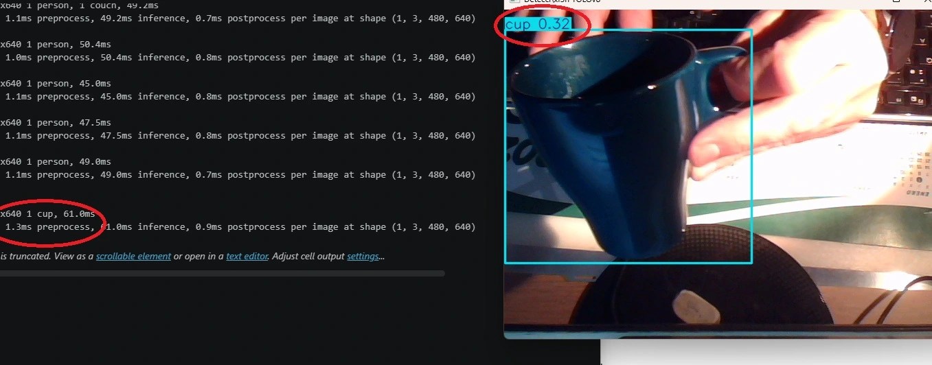 from ultralytics import YOLOimport cv2# Cargar modelo ligero (rápido para CPUs)model = YOLO("yolov8n.pt") cap = cv2.VideoCapture(0)cap.set(cv2.CAP_PROP_FRAME_WIDTH, 640)cap.set(cv2.CAP_PROP_FRAME_HEIGHT, 480)while True: ret, frame = cap.read() if not ret: break results = model(frame) annotated = results[0].plot() cv2.imshow("Deteccion YOLOv8", annotated) if cv2.waitKey(1) & 0xFF == ord('q'): breakcap.release()cv2.destroyAllWindows()
