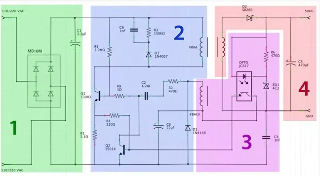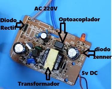 Bien hemos visto un esquema real anteriormente, ahora revisemos algunos conceptos esenciales. Las fuentes de alimentación conmutadas, como los cargadores de móviles, controlan su voltaje de salida mediante un optoacoplador y un diodo Zener.