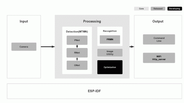 ESP-WHO es pues la utilidad de detección, reconocimiento e imagen son el núcleo de la plataforma constando en realidad de los siguientes módulos: