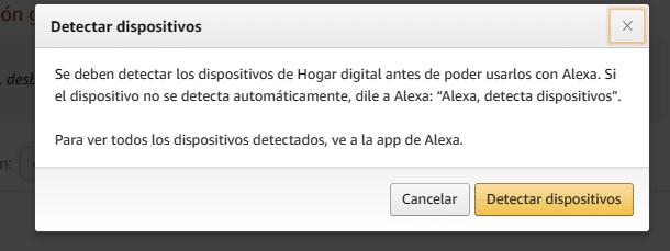 4-Una vez vinculadas ambas cuentas podemos cerrar la ventana, apareciendo una nueva ventana para detectar los nuevos dispositivos desde Alexa.
