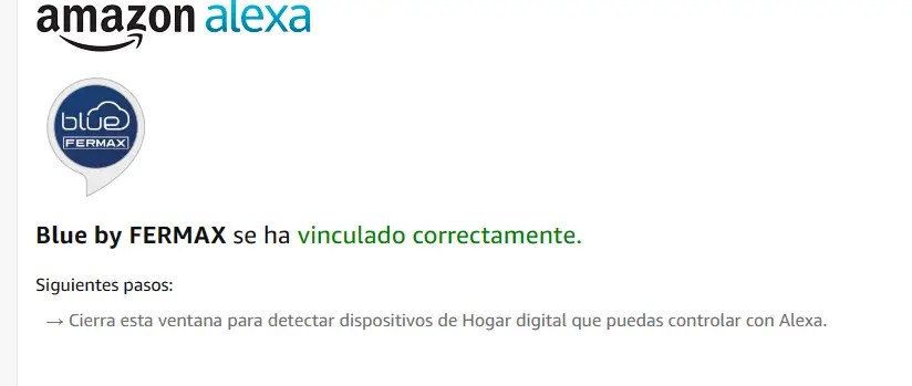 3-Si las credenciales son correctas nos llevará a una nueva ventana que nos informará sobre la vinculación del servicio de Fermax con Alexa.