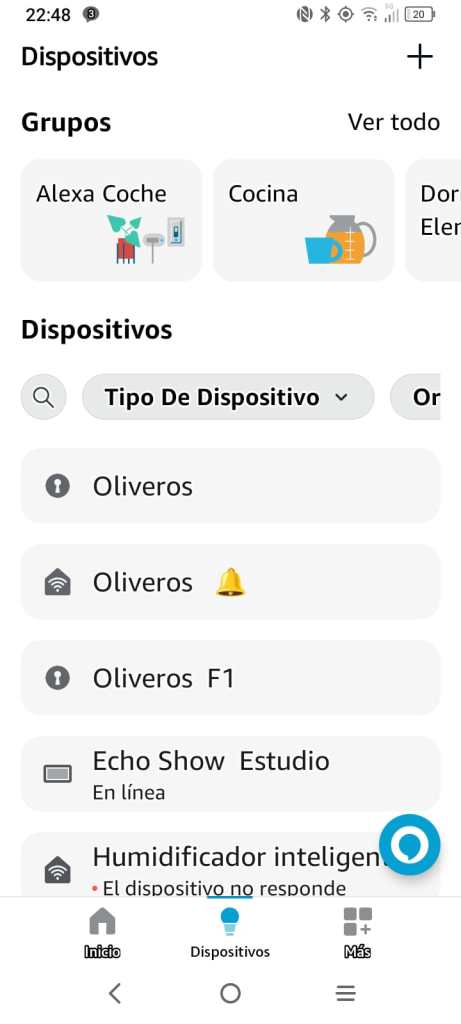Una vez detectados los nuevos dispositivos nos toca comprobar que deberemos tener en la app Alexa en Dispositivos los tres nuevos dispositivos: la cerradura, los avisos y el botón F1.