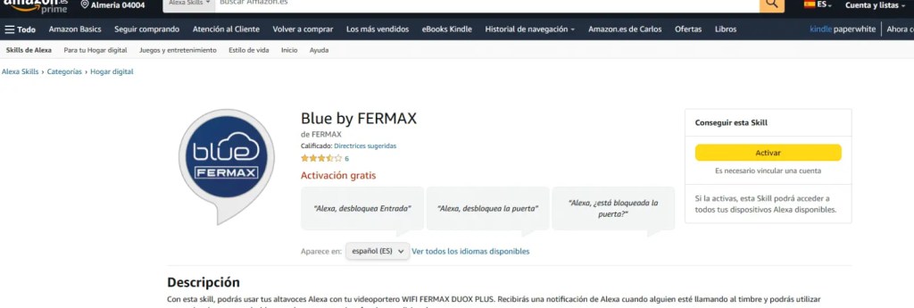 1-En primer lugar, validados con nuestra cuenta de Amazon nos vamos al portal de Amazon para instalar la skill de Alexa en la parte de Hogar digital:https://www.amazon.es/FERMAX-Blue-by/dp/B0CLKV4QSQ