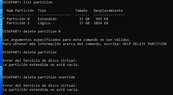 - Una vez que hayas eliminado todas las particiones lógicas, vuelve a ejecutar el comando