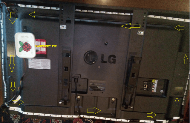 Realmente lo mas sencillo es por optar por tiras adhesivas WS2801 pues tienen la ventaja que la instalación es más discreta y queda mucho mejor. La desventaja es que seguramente tenga que cortar la tira para poder abarcar todo el perímetro de la televisión, lo cual implica que una vez que haya cortado y pegado cada trozo, tendrá que soldar un conector a ambos lados para volver a unir los contactos de la tira (aunque si no quiere soldar la tira esta la opción de comprar tantos metros de leds en formato continuo y pegar esta por todo el perímetro de la TV doblándolas en las esquinas.