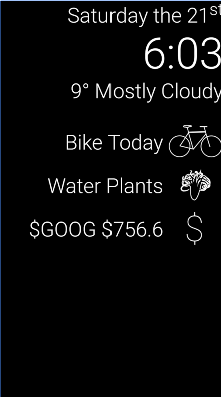El panel de la pantalla es bastante impresionante. Se puede ver la fecha y la hora a la derecha donde su cara sería. A la izquierda, se puede ver el tiempo actual y un pronóstico de 24 horas con algunos titulares de las noticias recientes de abajo. En su mayor parte, los iconos y el texto son en blanco y negro para evitar ser sea demasiado distraído.