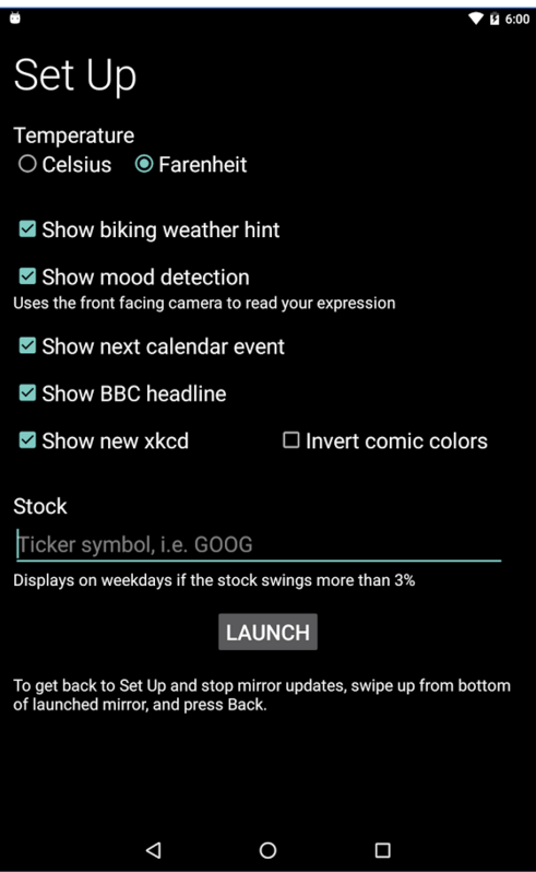 Esta app le puede decir las noticias, comprueba su estado de ánimo, y le muestra los cómics: todas esta información esta disponible mientras usted comprueba su cabello o se afeita.Esta aplicación es inusual pues como hemos dicho esta pensada para usarla detrás de un espejo de acrílico de dos vías.