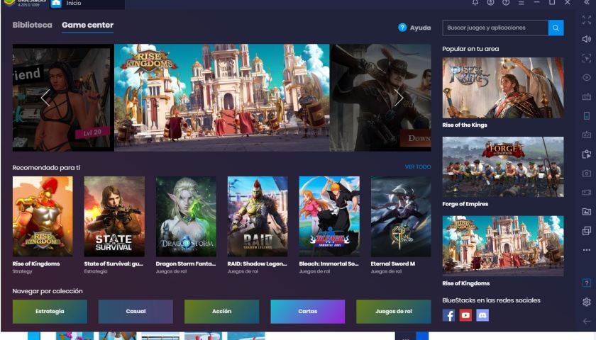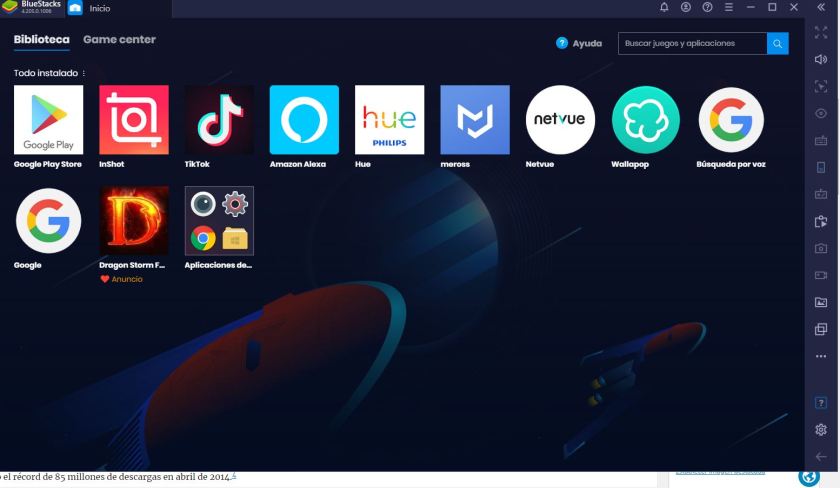 Asimismo BlueStacks incluye además su propio Centro de aplicaciones desde la pestaña superior junto a Biblioteca «Game Center «, que es algo así como un directorio, listado y top-ten de las aplicaciones y juegos en BlueStacks. En algunos casos la descarga nos llevará a Google Play por lo que lógicamente necesitará también iniciar sesión con una cuenta de Google.