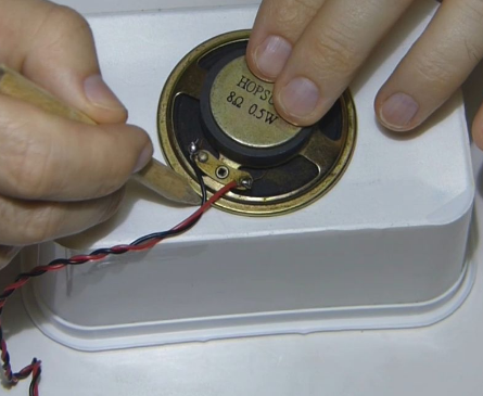 En cuanto a la colocación marcamos la circunferencia del altavoz en la parte trasera de la caja y a ese circulo practicamos orificios equidistantes y pegaremos con la pistola caliente el altavoz dentro de la caja, así como la botonera para que los pulsadores salgan y puedan ser usados desde el exterior.