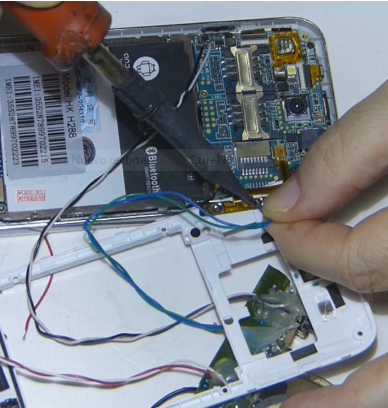Ahora toca el paso mas delicado,pues debe tener mucha precaución al soldar todos los cables, sobre todo los de encendido y volumen porque el cobre esta sobre una delgada lamina de plástico que si se calienta en exceso se estropeara,así que lo mejor es calentar el mínimo tiempo posible, colocar el cable e intentar enfriar rápidamente para intentar bajarles la temperatura de inmediato.