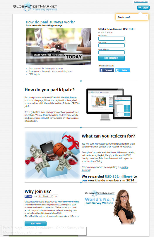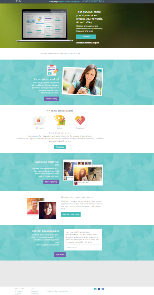 Este sitio invita a participar en encuestas por mail o por teléfono, pagándo a cambio en puntos, de tal forma que 100 puntos son 1 euro. Se puede cobrar un cheque por el dinero ganado a partir de 1000 puntos. El registro en este sitio es solo por invitación directa de ellos.