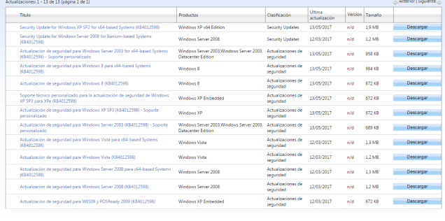 Obviamente  detectada este gran vulnerabilidad y el alcance posible de una eventual  infección  , los sistemas operativos con soporte más actuales fueron actualizados muy rápidamente por Microsoft , pero ahora dada la gravedad del ataque ,incluso otros más anticuados como Windows XP, Windows 8 y Windows Server 2003 , que ha estaban fuera de soporte  han recibido la necesaria actualización, la cual debería poder descargar inmediatamente desde http://www.catalog.update.microsoft.com/Search.aspx?q=KB4012598.