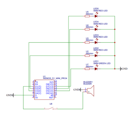 El receptor no puede ser mas sencillo pues básicamente se compone de un pequeño display de 5 leds conectados directamente a los 5 puertos (configurados como salidas digitales del ESP8266) mediante sendas resistencias de 680 ohmios . Además también para que sea perceptible realmente la llamada, usaremos un pequeño zumbador piezoeléctrico de alta potencia conectado también a un puerto del microcontrolador con un interruptor en serie para poder cortar el sonido y no moleste si es persistente porque si lo veremos con una indicación luminosa.