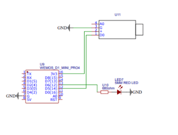 La parte del transmisor es si cabe mas simple pues únicamente se compone del detector de sonido cuya salida se conecta a un pin de entrada digital del ESp8266.