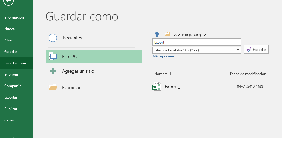 Antes de proseguir , en caso de tener ficheros excel en formato muy antiguos( por ejemplo Excel 95) . deberemos convertir estos al menos al formato excel 97, para ello, en caso de que el formato sea de excel 95 deberemos abrir dicho fichero e irnos a la opción Guardar como seleccionamos «libro de Excel 97-2003(*.xls)»