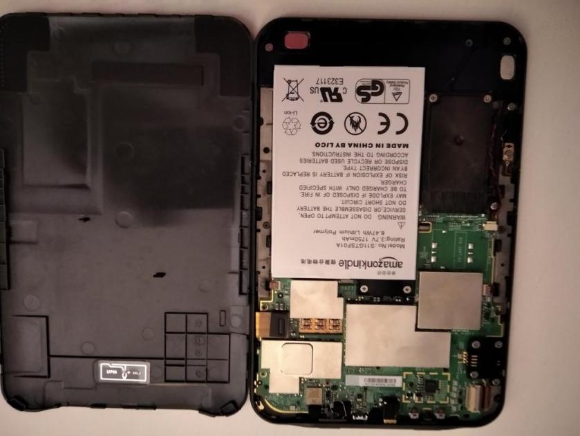 Verá inmediatamente la gran batería negra que tiene la etiqueta «Amazon.com» junto con las otras exenciones de responsabilidad. Este es el primer componente que se debe quitar, que se mantiene en su lugar con 2 tornillos Phillips en la parte superior izquierda.