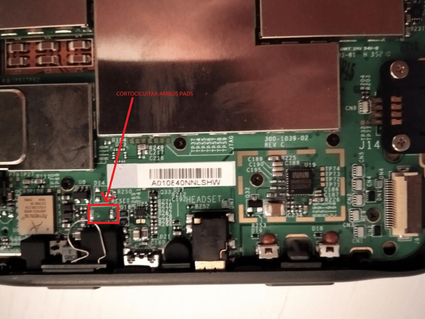 Ahora puede cruzar los terminales con un pequeño puente o usando un simple destornillador tocando ambos pads estañados . Con esto si todo lo demás no funciono y la placa madre no esta dañada, ya debería de haber resuelto el problema una vez que vuelva a intentar encender el kindle
