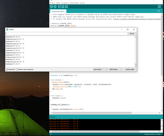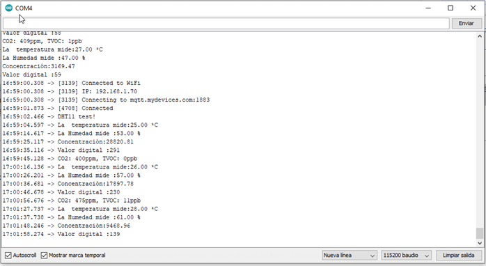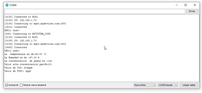 Ahora sólo nos queda cargar el código a la placa. Abra el monitor serie y tendrá algo parecido a esto.