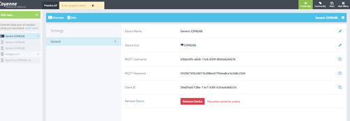 En esa pantalla podremos modificar el nombre, pero sobre todo es aquí donde obtendremos todos los parámetros del dispositivo que necesitaremos configurar en ESP32 para que se pueda conectar y enviar o recibir datos de la plataforma Cayenne.