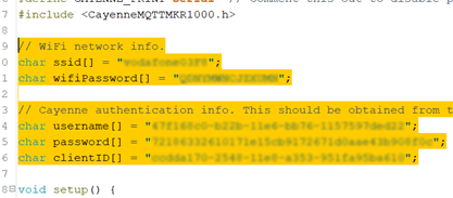En este código ya viene configurado el username, password y el clientID necesarios para conectar a Cayenne myDevices. Sin embargo, nos queda rellenar el nombre de la red WiFi (ssid) y la contraseña (wifiPassword).