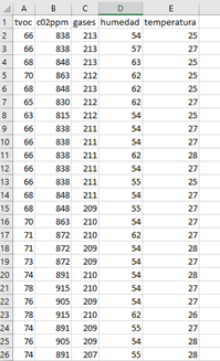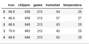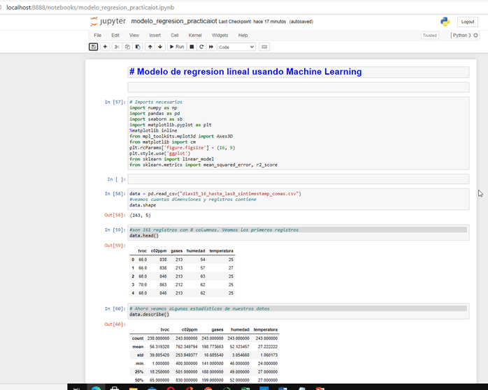 Vamos a crear nuestros datos de entrada por el momento sólo con los datos de Tvoc y como etiquetas la temperatura y humedad Creamos además el objeto LinearRegression y lo hacemos “encajar” (entrenar) con el método fit ().