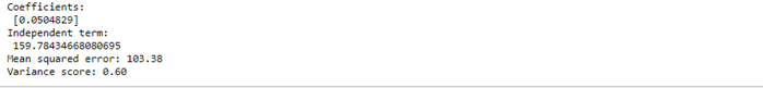 Tenemos un Error Cuadrático de 103,38 que no es muy malo como se ve reflejado en el puntaje de Varianza que debería ser cercano a 1.0 (el valor obtenido es 0.60).