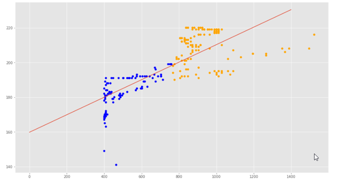 Veamos a continuación los datos de regresión lineal con la recta que obtuvimos: