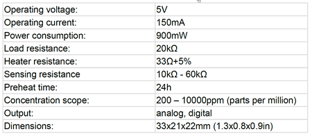 A continuación, podemos ver una tabla de resumen con los distintos modelos de sensores disponibles, los gases a los que son sensibles, y algunos datos sobre el calentador, aunque no obstante deberíamos consultar detalladamente el Datasheet de cada sensor MQ particular antes de emplearlo para detallar sus especificaciones técnicas, especialmente la tensión de alimentación del calentador, el tiempo de calentamiento, y la curva de sensibilidad del sensor.