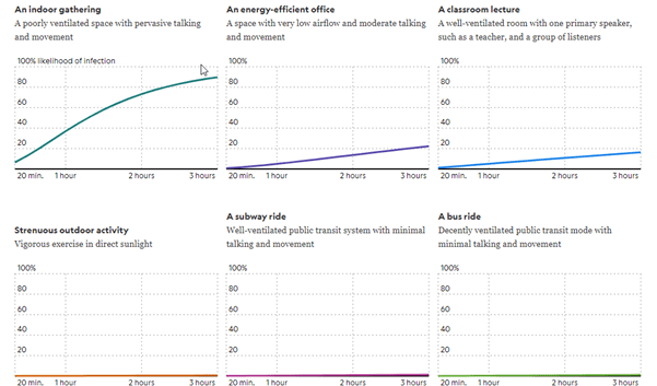No obstante, a pesar de usar medios de protección, los riesgos de transmisión de COVID-19 en habitaciones abarrotadas y condiciones de mala ventilación, y en cualquiera de estos entornos, el tiempo es clave, por lo que cuanto más tiempo pase alguien en un espacio mal ventilado o lleno de gente, mayor será el riesgo previsto de enfermarse.