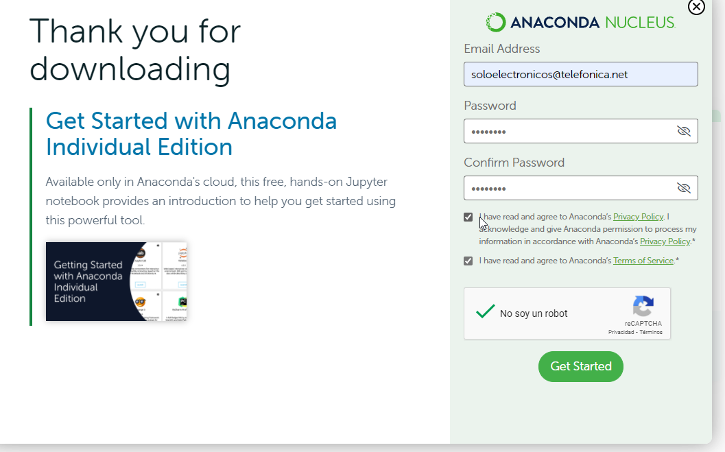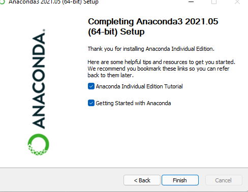 Si desea leer más sobre Anaconda.org y cómo comenzar con Anaconda, marque las casillas “Tutorial de Anaconda Edición Individual” y “Aprenda más sobre Anaconda”. Haga clic en el botón Finalizar.