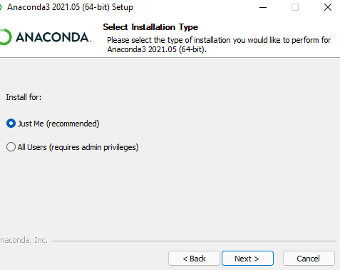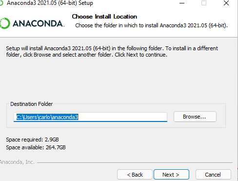 Seleccione una carpeta de destino para instalar Anaconda y haga clic en el botón Siguiente. Nota: Instale Anaconda en una ruta de directorio que no contenga espacios ni caracteres Unicode..No lo instale como administrador a menos que se requieran privilegios de administrador.