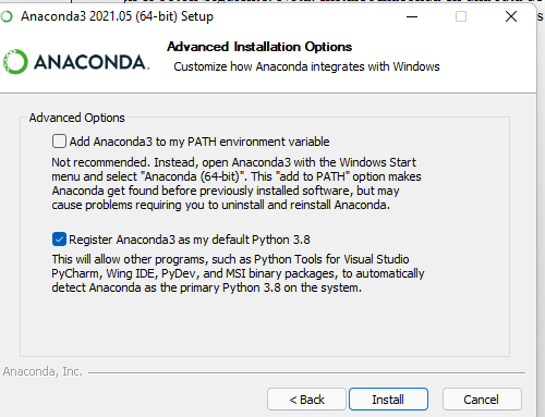A menos que planee instalar y ejecutar múltiples versiones de Anaconda o múltiples versiones de Python, acepte el valor predeterminado y deje esta casilla marcada.