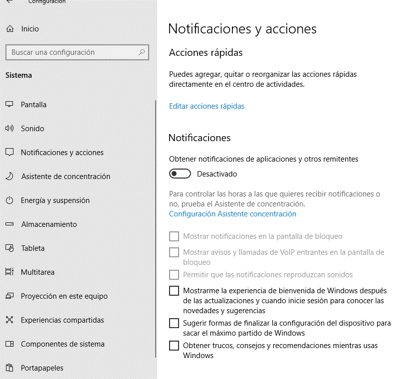 Las notificaciones en Windows 10 pueden llegar a ser bastante molestas y hasta enlentecer el sistema a pesar de que a veces carecen totalmente de utilidad. Para deshacerse de ellas solo tienes que ir a Configuración > Sistema > Notificaciones y acciones y desactivarlas por completo, o desactivarlas para las aplicaciones específicas que prefiera. Incluso puede desactivar notificaciones especiales del sistema con sugerencias, recomendaciones y demás