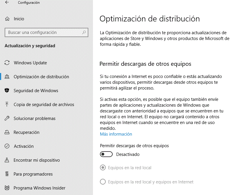 Windows 10 tiene una función bastante molesta y con este nombre que sirve para que tu equipo envíe partes de aplicaciones y actualizaciones de Windows que has descargado a otros ordenadores en tu red local o Internet. Esto suele venir activo por defecto y puede hacer que tu conexión a Internet y tu PC en general se pongan bastante lentos. Para desactivarla debe ir a la Configuración > Actualización y seguridad > Optimización de distribución y cambiar a Desactivado la casilla «Permitir descargas de otros equipos».