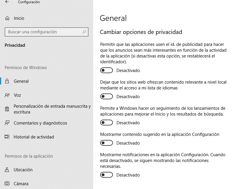 Desde la sección General en las opciones de Privacidad en la Configuración en Windows 10 puedes desactivar cuatro opciones que a veces pueden causar molestias en tu experiencia. Estas están relacionadas con sugerencias y privacidad personalizada, pero desactivarlas puede evitar que empiece a ver sugerencias de apps en el Menú Inicio, la búsqueda o incluso la misma app de Configuración.