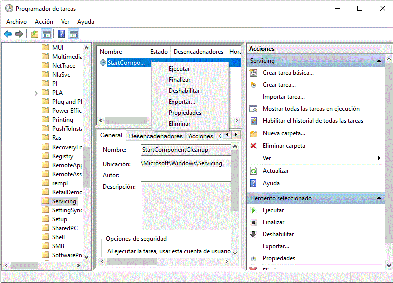 4. En el panel central, haz clic derecho en StartComponentCleanup y selecciona Ejecutar.