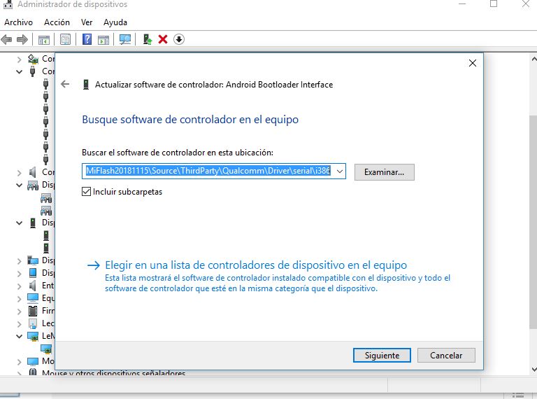 - Después de seleccionar la opción Buscar software de controlador en el equipo, tendremos que buscar la ruta donde se instalaron los controladores del programa MI Flash si no cambiaste la ruta de instalación entonces tendría que ser la siguiente: C:\XiaoMi\XiaoMiFlash\Source\ThirdParty\Qualcomm\Driver