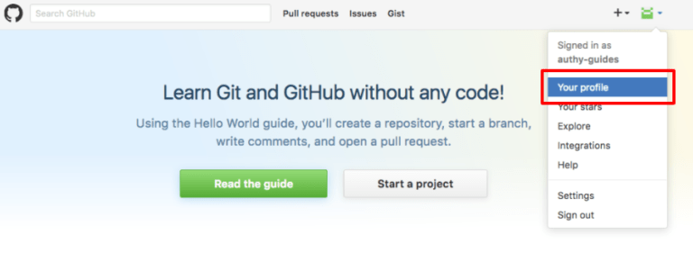 Ahora acceda a su cuenta de GitHub abre el menú desde el icono superior derecho que muestra la imagen de tu cuenta. Seleccione «Tu perfil»