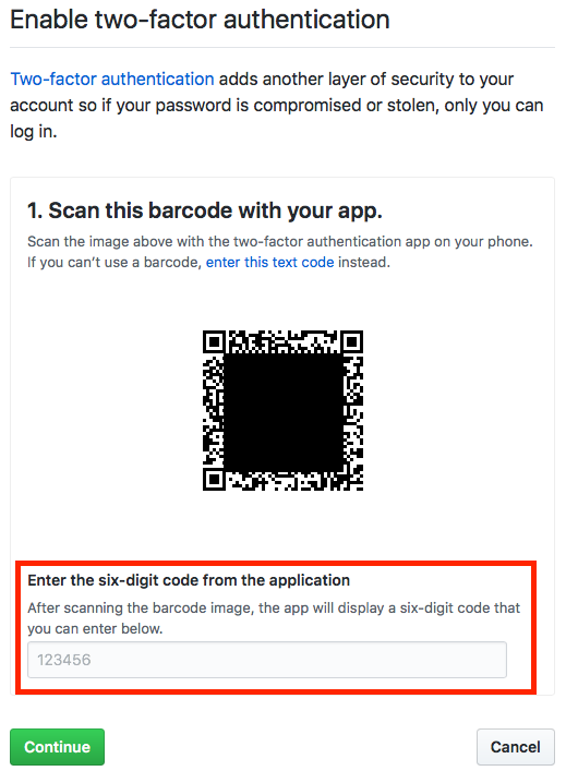 Una vez que el token esté en Authy, escriba el código 2FA resultante de nuevo en GitHub y haga clic en Continuar.