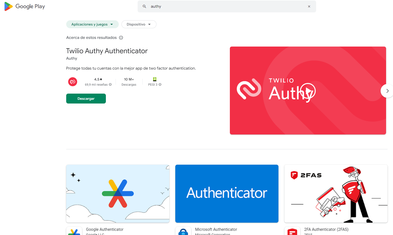 En primer lugar instalaremos Authy en su dispositivo buscándola en la tienda de aplicaciones de su dispositivo Android o Ios.