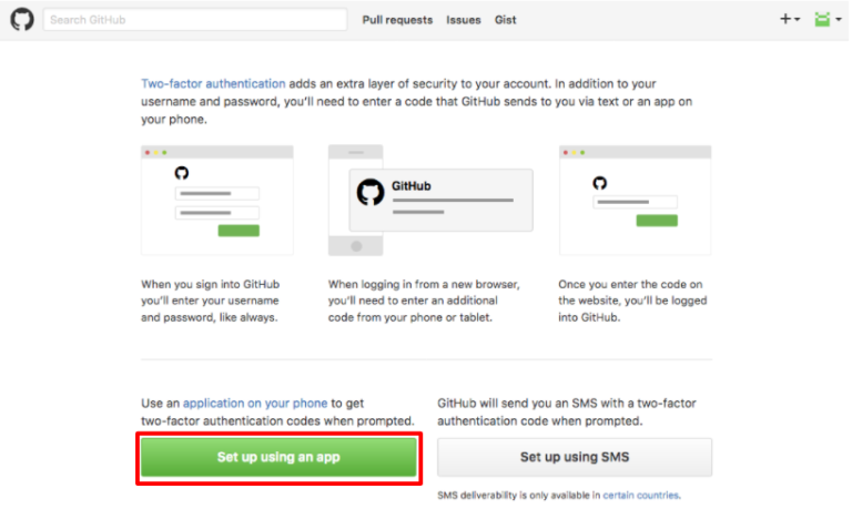 También puede utilizar GitHub Mobile para la autenticación en dos fases después de configurar una aplicación móvil TOTP o mensajes de texto. GitHub Mobile utiliza criptografía de clave pública para proteger su cuenta, lo cual le permite utilizar cualquier dispositivo móvil que hayas usado para iniciar sesión en GitHub Mobile como segundo factor. Ciertamente no esta de mas tener instalada la app de Github en otro dispositivo, pero tenerla instalada no es necesariamente garantía de poder usar 2FA, así que para estar seguros lo mejor es instalar un app de gestión de 2FA ( !aunque haya instalado Github Mobile!)