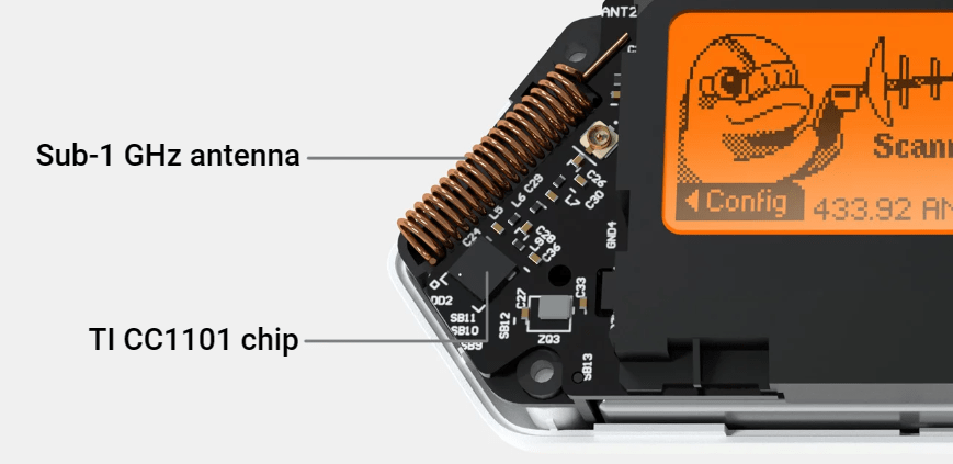 Por todo ello el Flipper puede usarse como transceptor de radio (sub 1 GHz) para una larga lista de dispositivos que funcionan con ciertas frecuencias de radio (puertas de garaje, sensores IoT, llaves de coches, etc.), Flipper Zero puede escanear, grabar y reproducir estas señales.