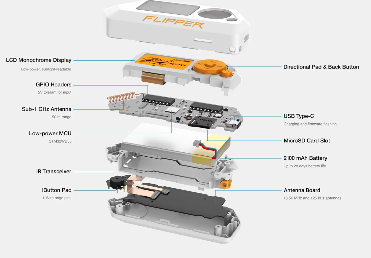 El Flipper Zero está equipado con una serie de sensores y transmisores, que le permiten interactuar con una variedad de dispositivos y sistemas. Estos incluyen: