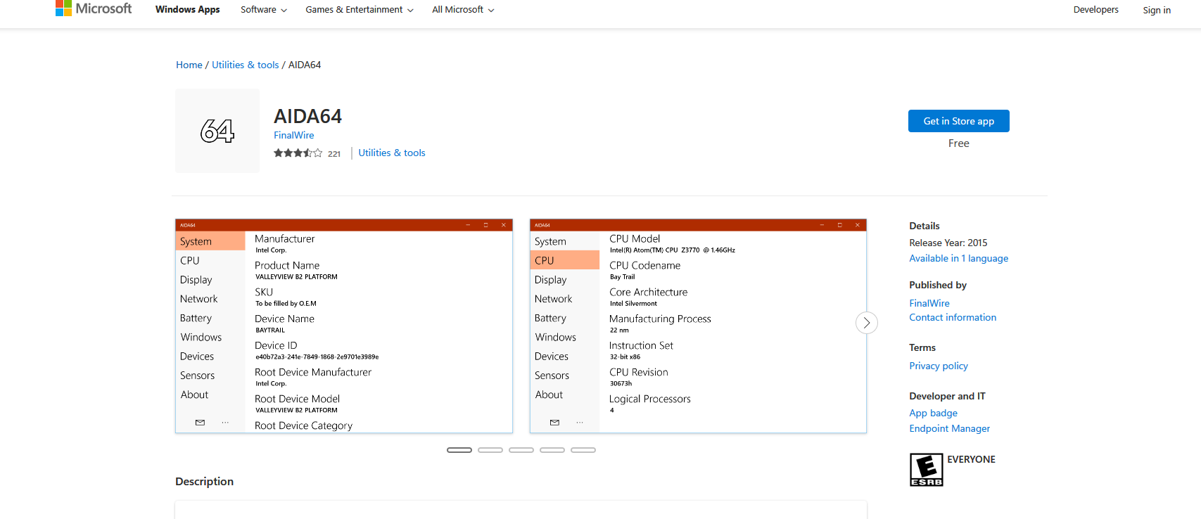 Los requisitos del sistema son Windows 10 o Windows Phone 8.1 y los permisos requeridos: Internet, almacenamiento extraíble. AIDA64 requiere este permiso para detectar el espacio total y libre del almacenamiento externo (tarjeta SD) y cámara Web. AIDA64 requiere este permiso para mostrar información de la cámara como la resolución de la imagen. AIDA64 no hace fotos ni vídeos.