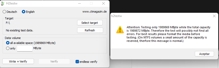 La función de H2testw es bastante simple: Llena el directorio de destino con datos de prueba y, a continuación, los vuelve a leer y los verifica.