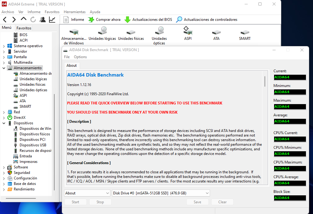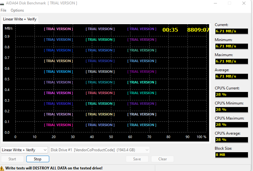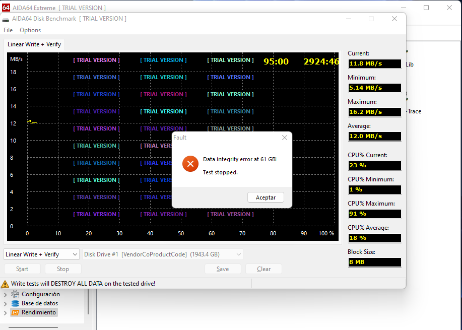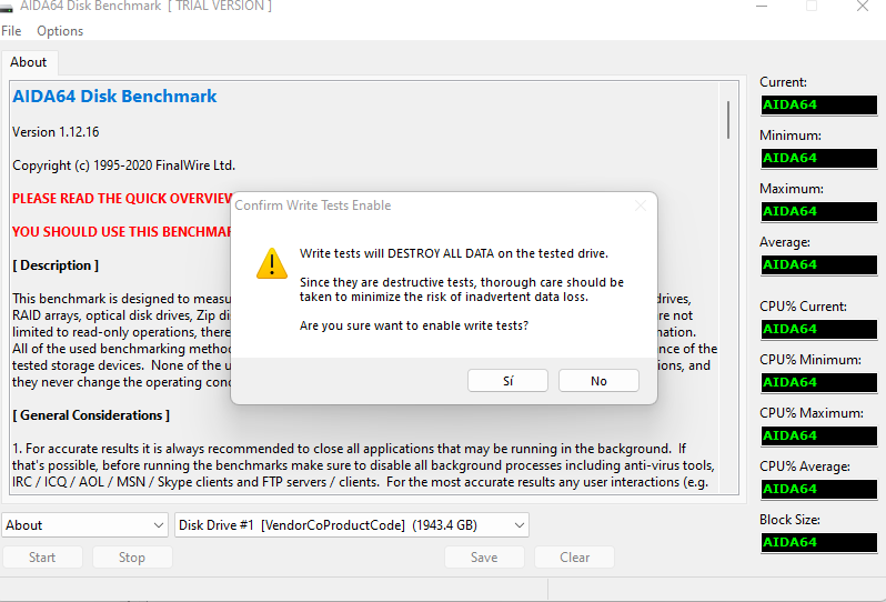 - Pruebas de escritura :Si activamos las pruebas de escritura, estarán disponibles los siguientes 6 modos de prueba adicionales: Escritura lineal, Escritura aleatoria, Escritura con búfer, Acceso medio de escritura, Escritura lineal + verificación y Escritura aleatoria + verificación. Al realizar pruebas de escritura, todos los datos se perderán en el dispositivo de almacenamiento, y AIDA64 nos advierte de ello tres veces al iniciar el proceso.